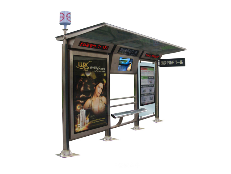 公交車候車亭一般是與公交站牌相配套的,為方便公交乘客候車時遮陽、防雨等,在車站、道路兩旁或綠化帶的港灣式公交停靠站上建設的交通設施。由于城市公交的日益發達,候車亭已發展成為城市一個不可或缺的重要組成部分,設計精美的候車亭也成為了城市一道美麗的風景。 一般候車亭棚體主要頂棚、立柱、頂弓、廣告燈箱和坐凳組成,也有用隔板來代替廣告燈箱的。