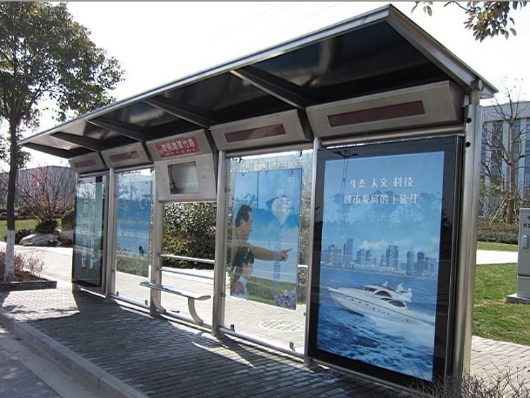 公交車候車亭一般是與公交站牌相配套的,為方便公交乘客候車時遮陽、防雨等,在車站、道路兩旁或綠化帶的港灣式公交?空旧辖ㄔO的交通設施。由于城市公交的日益發達,候車亭已發展成為城市一個不可或缺的重要組成部分,設計精美的候車亭也成為了城市一道美麗的風景。 一般候車亭棚體主要頂棚、立柱、頂弓、廣告燈箱和坐凳組成,也有用隔板來代替廣告燈箱的。