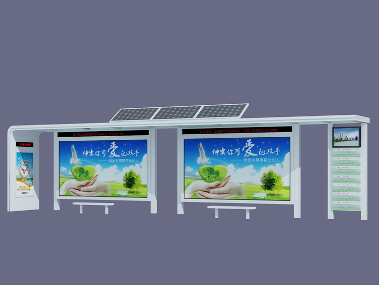 公交車候車亭一般是與公交站牌相配套的,為方便公交乘客候車時遮陽、防雨等,在車站、道路兩旁或綠化帶的港灣式公交停靠站上建設的交通設施。由于城市公交的日益發達,候車亭已發展成為城市一個不可或缺的重要組成部分,設計精美的候車亭也成為了城市一道美麗的風景。 一般候車亭棚體主要頂棚、立柱、頂弓、廣告燈箱和坐凳組成,也有用隔板來代替廣告燈箱的。