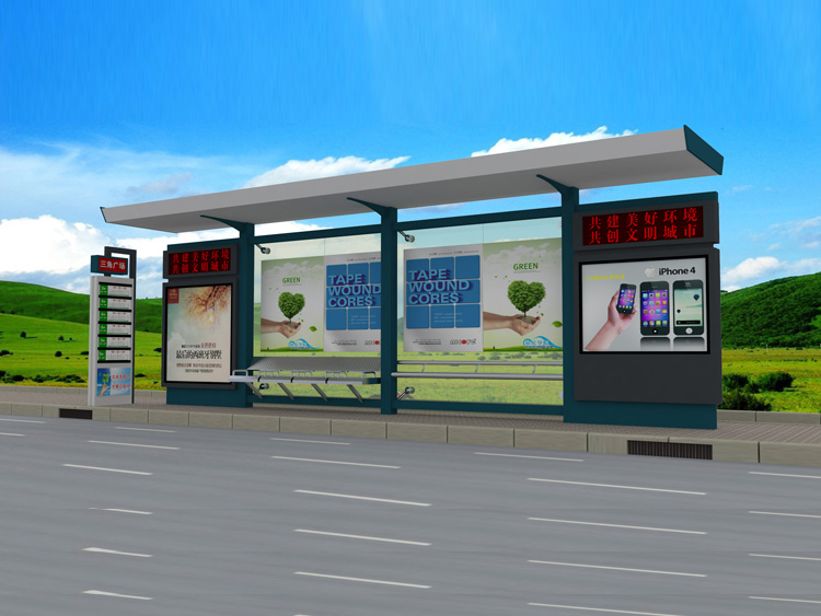 公交車候車亭一般是與公交站牌相配套的,為方便公交乘客候車時遮陽、防雨等,在車站、道路兩旁或綠化帶的港灣式公交停靠站上建設的交通設施。由于城市公交的日益發達,候車亭已發展成為城市一個不可或缺的重要組成部分,設計精美的候車亭也成為了城市一道美麗的風景。 一般候車亭棚體主要頂棚、立柱、頂弓、廣告燈箱和坐凳組成,也有用隔板來代替廣告燈箱的。