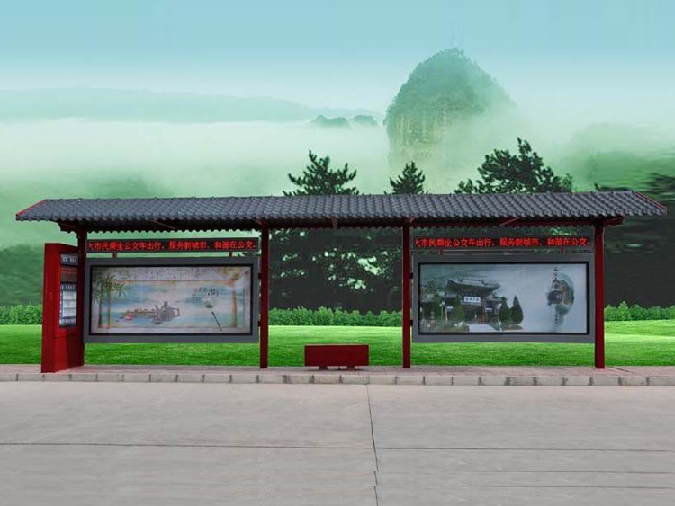 公交車候車亭一般是與公交站牌相配套的,為方便公交乘客候車時遮陽、防雨等,在車站、道路兩旁或綠化帶的港灣式公交停靠站上建設的交通設施。由于城市公交的日益發達,候車亭已發展成為城市一個不可或缺的重要組成部分,設計精美的候車亭也成為了城市一道美麗的風景。 一般候車亭棚體主要頂棚、立柱、頂弓、廣告燈箱和坐凳組成,也有用隔板來代替廣告燈箱的。